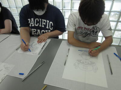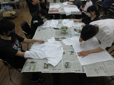 上板町の「技の館」から講師先生をお招きして藍についてのご講義を頂いた後、ろうけつ染めを行いました。
